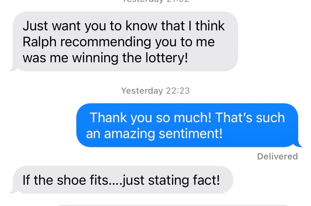 When I went to brush my teeth, I noticed a text that hit me hard. It read, “Just wanted you to know that I think Ralph recommending you to me was me winning the lottery!”