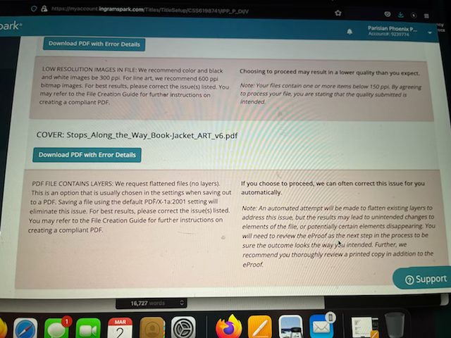 The second error is about the cover file. Apparently, the PDF had layers. I had no idea even to look. (Something to add to the pre-press checklist.) I usually flatten my work before making a PDF because layers bloat the size of a PDF. I emailed the cover designer, I’ll probably get that tonight. And reupload it.