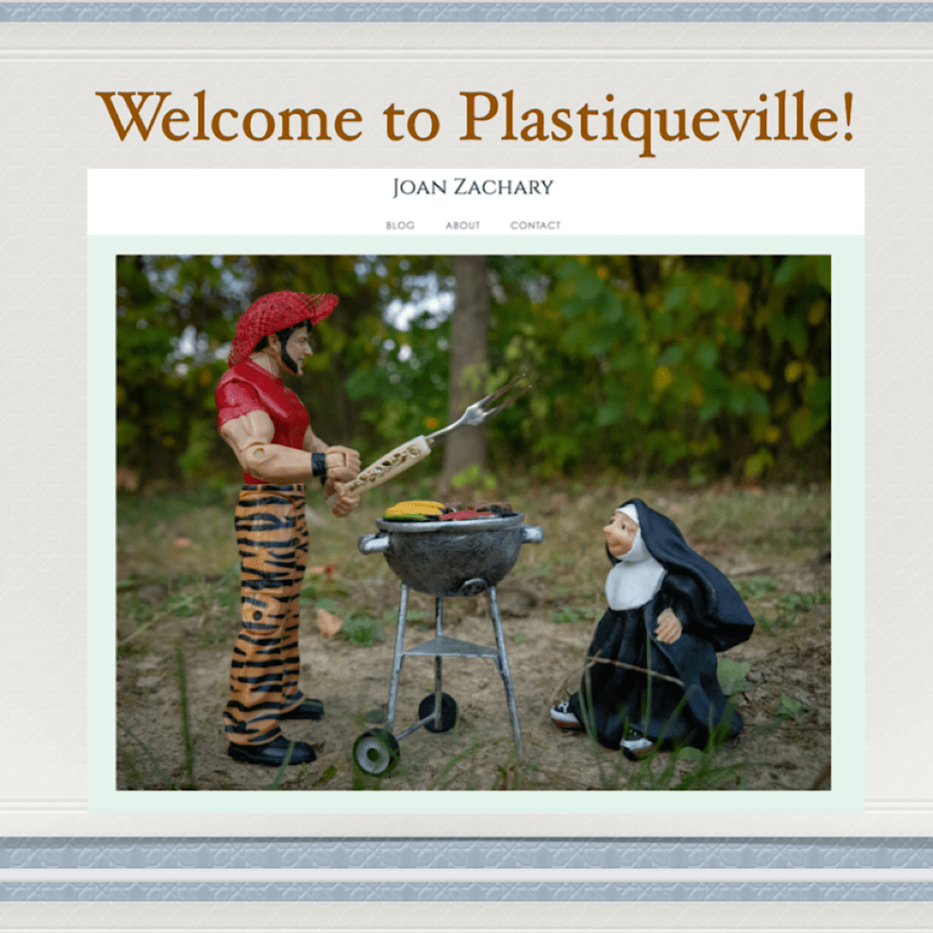 Joan likes to photograph small plastic figures that she has created a universe for— Plastiqueville. Gayle wanted to capture the playfulness of the Plastiqueville in the rom-com, Trapped. See more of Plastiqueville here.