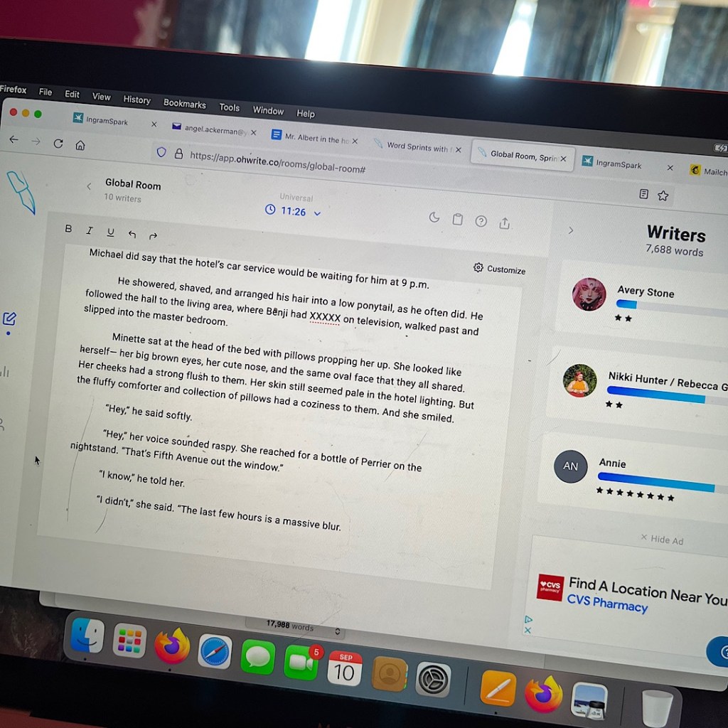 It’s just the write blend of silly and informative. Apparently, Sacha got Rachael hooked on OhWrite.co, a free website that offers competitive writing sprints. Each writer gets a blank document in either a global or a private room. (I did start one for Parisian Phoenix called Friends of Parisian Phoenix Publishing.) Writers can see the avatar and word count of other writers’ in the room but you can’t see their work.