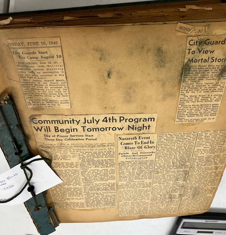 A resident had been passing by a neighbor’s home and saw this scrapbook on the top of a garbage can. She opened it, and upon reading the contents brought it home. She had discovered that this scrapbook dates to 1940 and features newspaper clippings of Wilson Borough’s residents involvement in World War II. The whole scrapbook is nothing but a record of the legacy the local community had in the war eighty years ago.