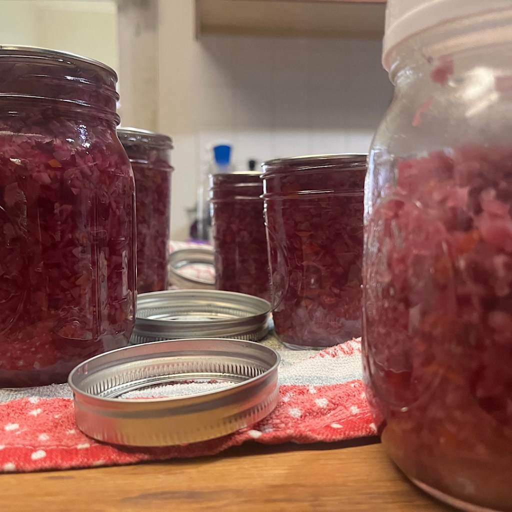 9 a.m.: Get distracted by a head of purple cabbage. Clean kitchen while watching reruns of S.W.A.T., use Ninja kitchen system to whip up batch of sassy Asian-style slaw and gather equipment to hot water bath for better shelf life. Receive notification that Larry Sceurman’s essay on our modern need for nature has posted on the Parisian Phoenix blog. Text him to let him know.