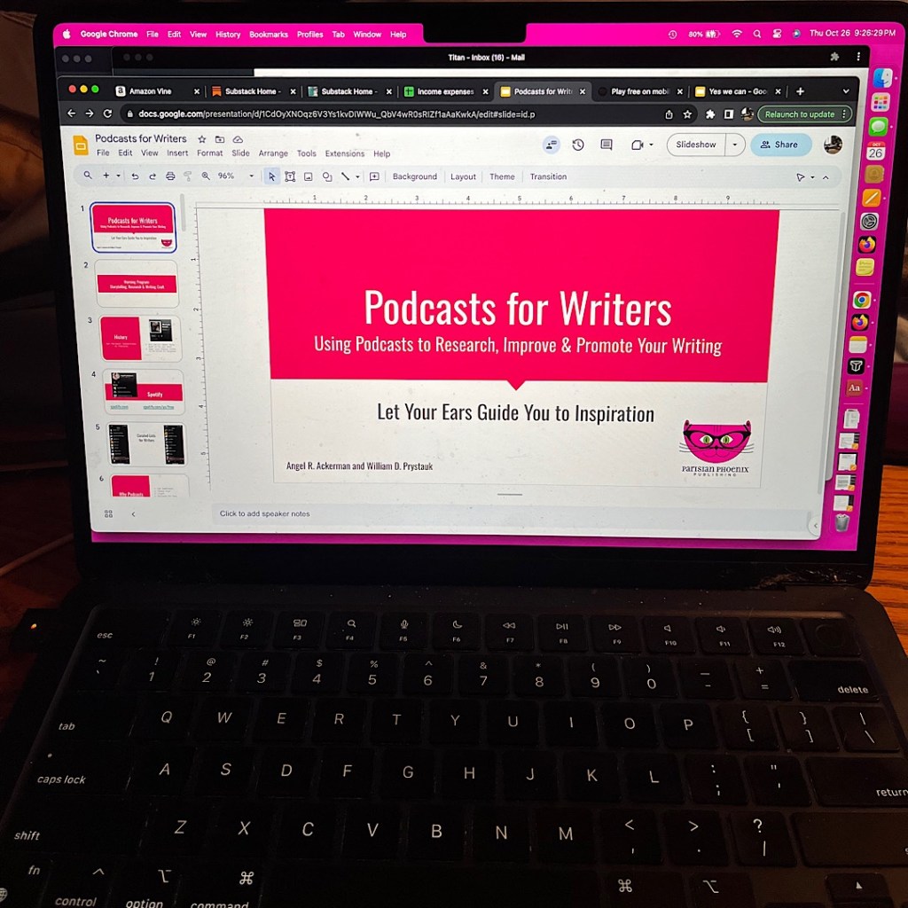 William D. Prystauk* will be my willing accomplice as we discuss the opportunities to find podcasts that will do all of these things. With Spotify and some quiet moments while you wash dishes or drive the car, curating podcast lists— if you find the right ones— can help you bolster your storytelling, increase your timeliness and factualness, learn tips about the publishing industry, and fill in the gaps of your social media/marketing/Bookbub whatever-else-is-constantly-changing knowledge.