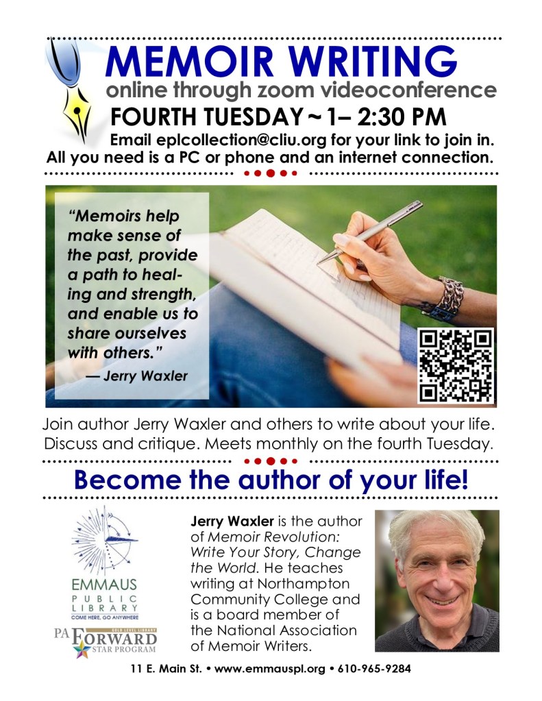 Jerry hosts a memoir writing group through a local public library in Emmaus, Pa., that has now gone virtual (again, thank you pandemic) and I’ve been putting off starting my medical advocacy/disability memoir for almost two years now. Since I know Jerry to be a good listener, a kind soul and an encouraging memoirist, I thought maybe visiting his group would be the kick in the butt I need.