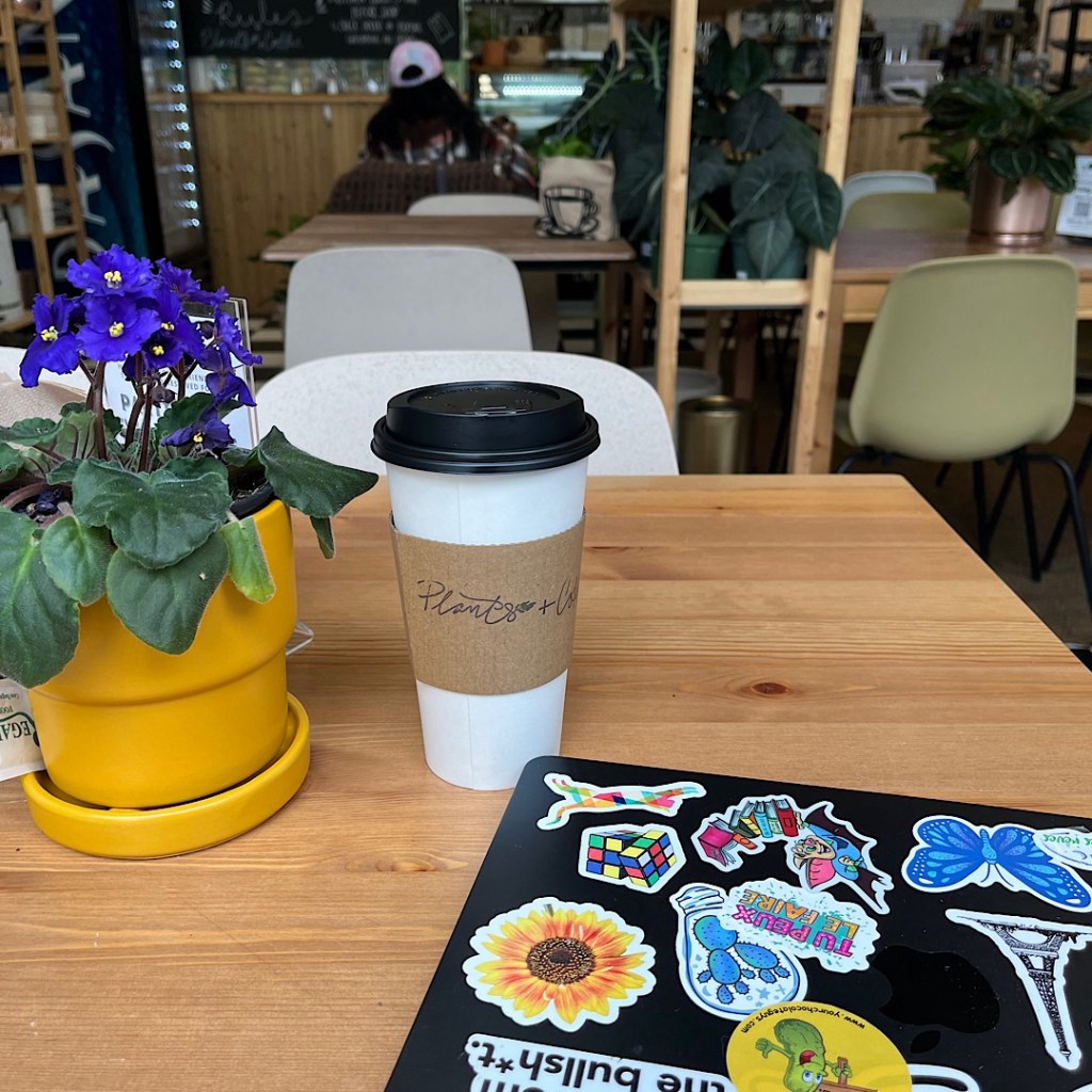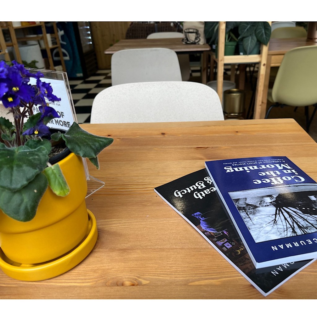 In that spirit, I went down to Plants + Coffee for a meeting with LN Passmore. We’re on the board together at Greater Lehigh Valley Writers Group and she has books for the group’s appearance next week at Phillipsburg Comic Con. She also wanted to see Larry Sceurman’s short story collection, Coffee in the Morning, while we enjoyed coffee (and plants) in the morning.