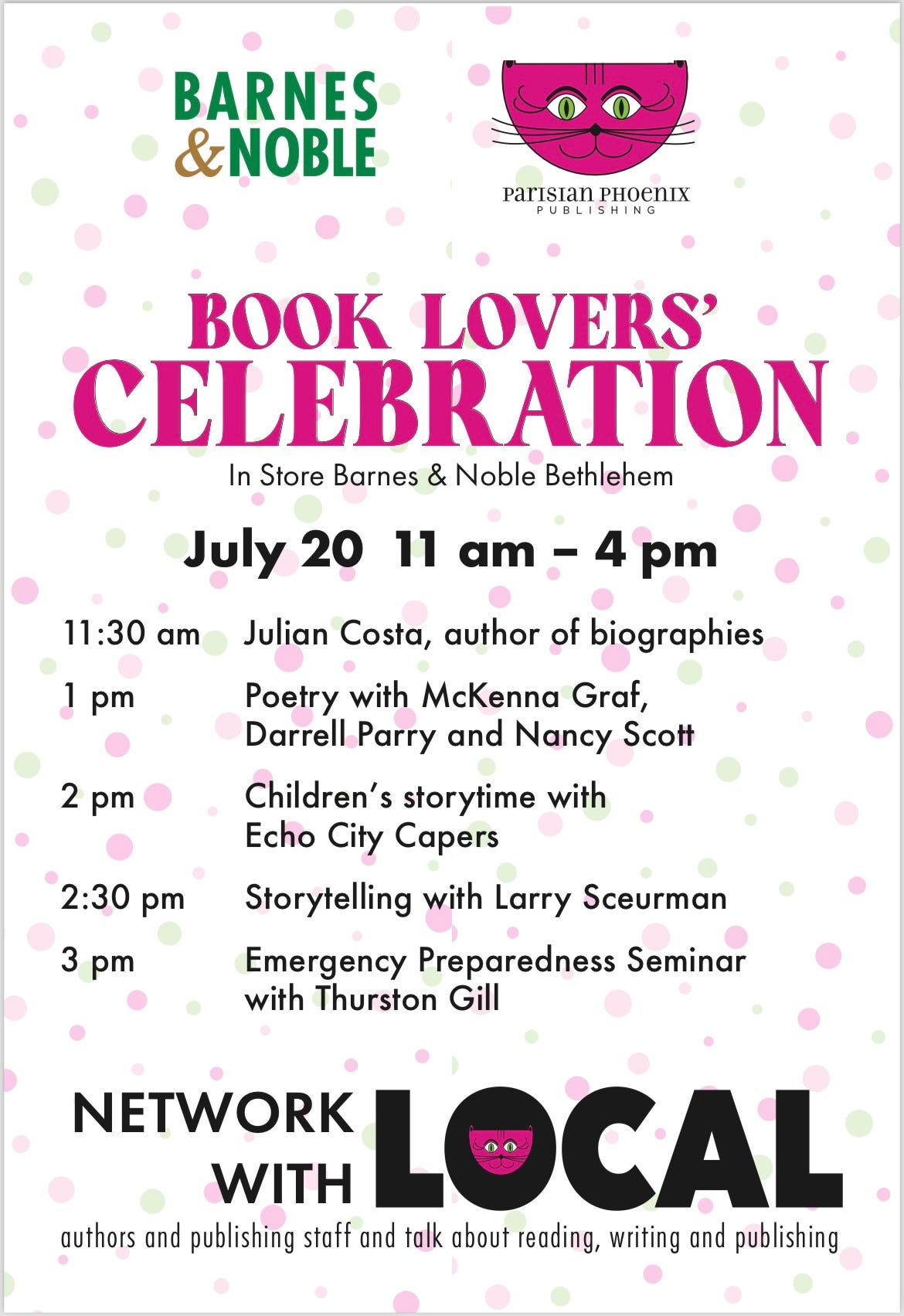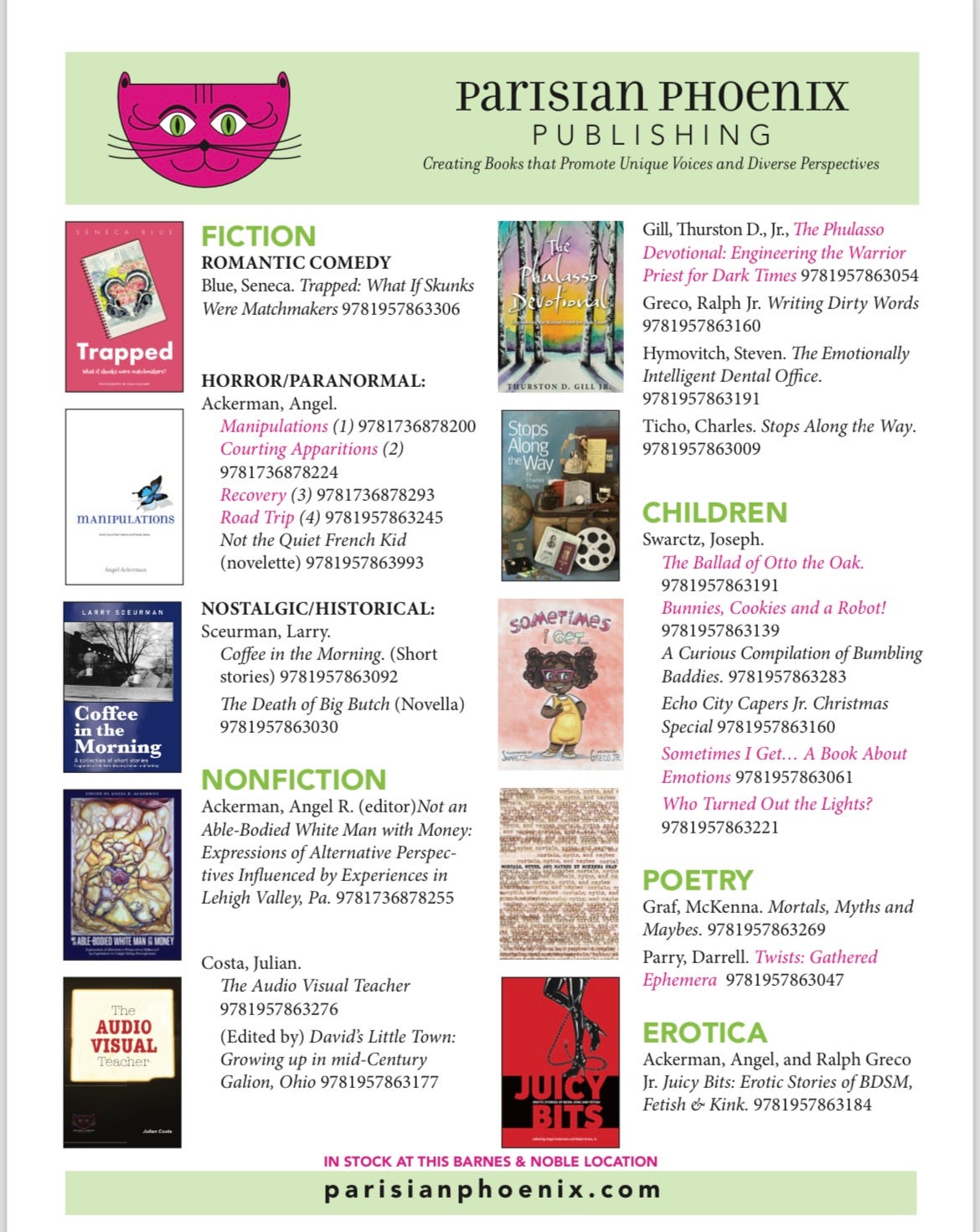 We will have multiple authors on hand to sign books and Barnes & Noble has multiple Parisian Phoenix books from multiple genres in stock.