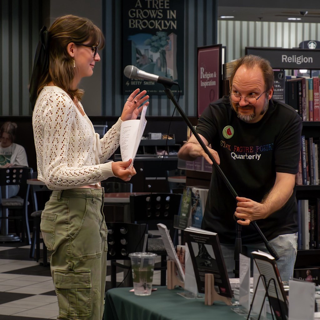 At 1 p.m., we had a poetry reading with Darrell Parry, McKenna Graf and Nancy Scott. Barnes has copies of Darrell’s book Twists: Gathered Ephemera and they also picked up McKenna’s Mortals, Myths and Maybes. Give us a few days and we may have some video highlights to share.