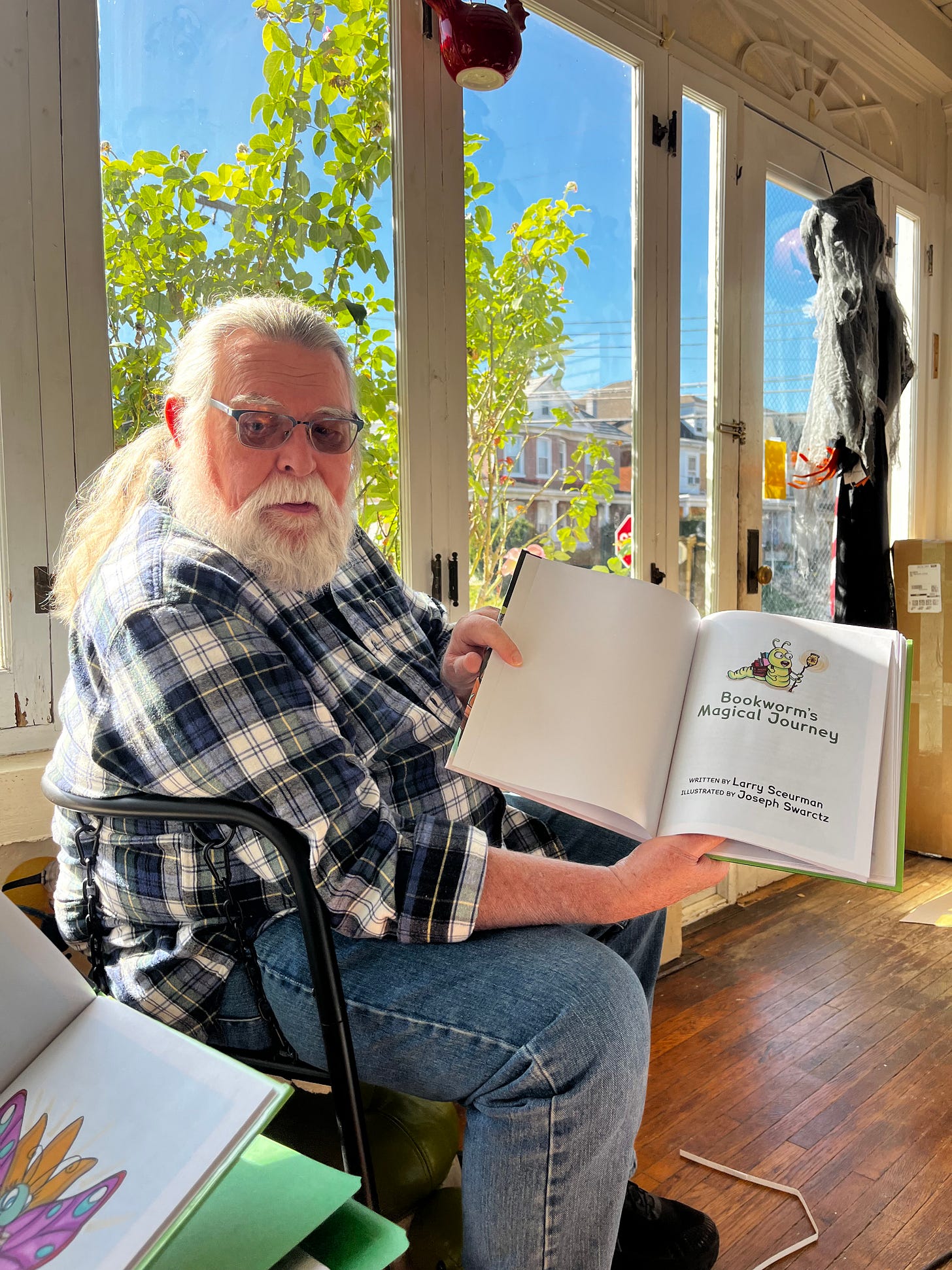 Bookworm’s Magical Journey had a magnificent launch— the book has sold in three countries so far in its first week. Our local libraries have expressed interest in carrying this dyslexia-friendly title. Yesterday, author Larry Sceurman and his beautiful wife, Barbara, stopped by my warm and cozy sunporch to pick up some early review copies of the hardcover, some promotional bookmarks and Larry’s author one sheet so he can book his upcoming storytelling events.