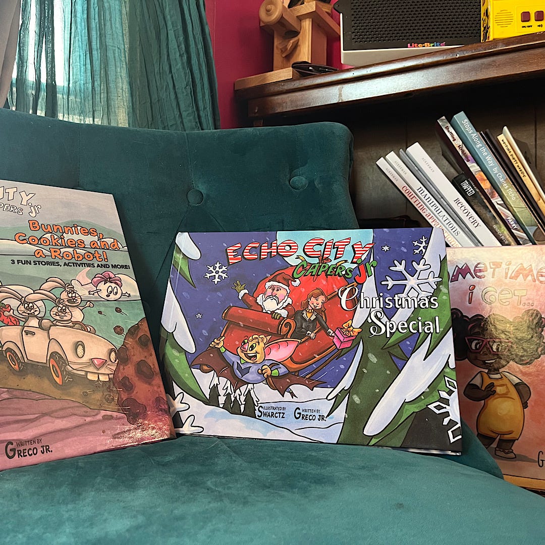 Don’t forget about their latest book, Sprinkles Did It! about Eugene and his imaginary friend, Sprinkles, and the classic, holiday-themed Echo City Capers Jr. Christmas Special where Santa and Nightbat team up to save Christmas from the Megamall.