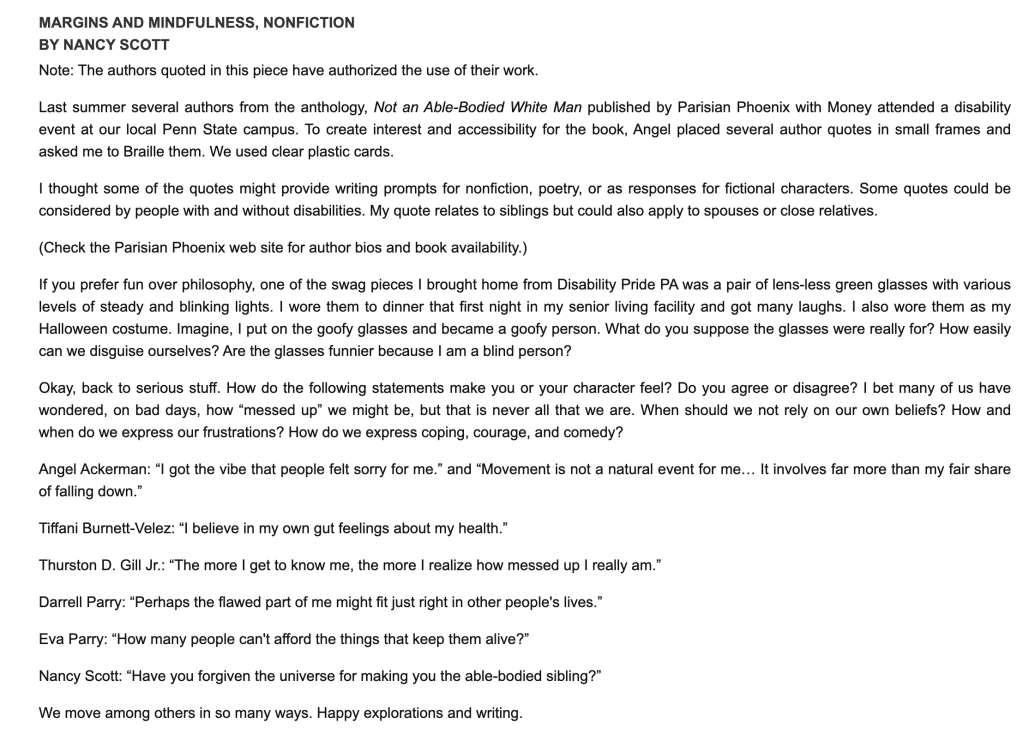 The screen shot below shows some, but not all of the piece, which highlights quotes from non-fiction essays by authors Tiffani Burnett-Velez, Thurston Gill Jr., Darrell Parry, Eva Parry, Nancy and myself, Angel Ackerman.