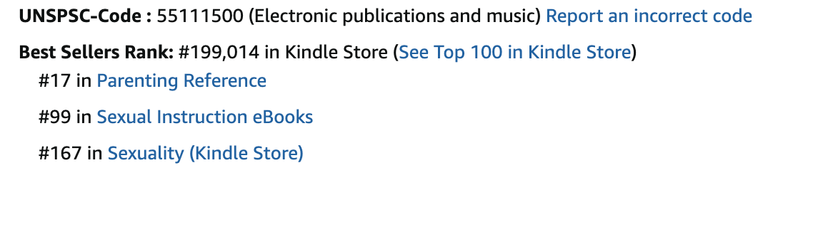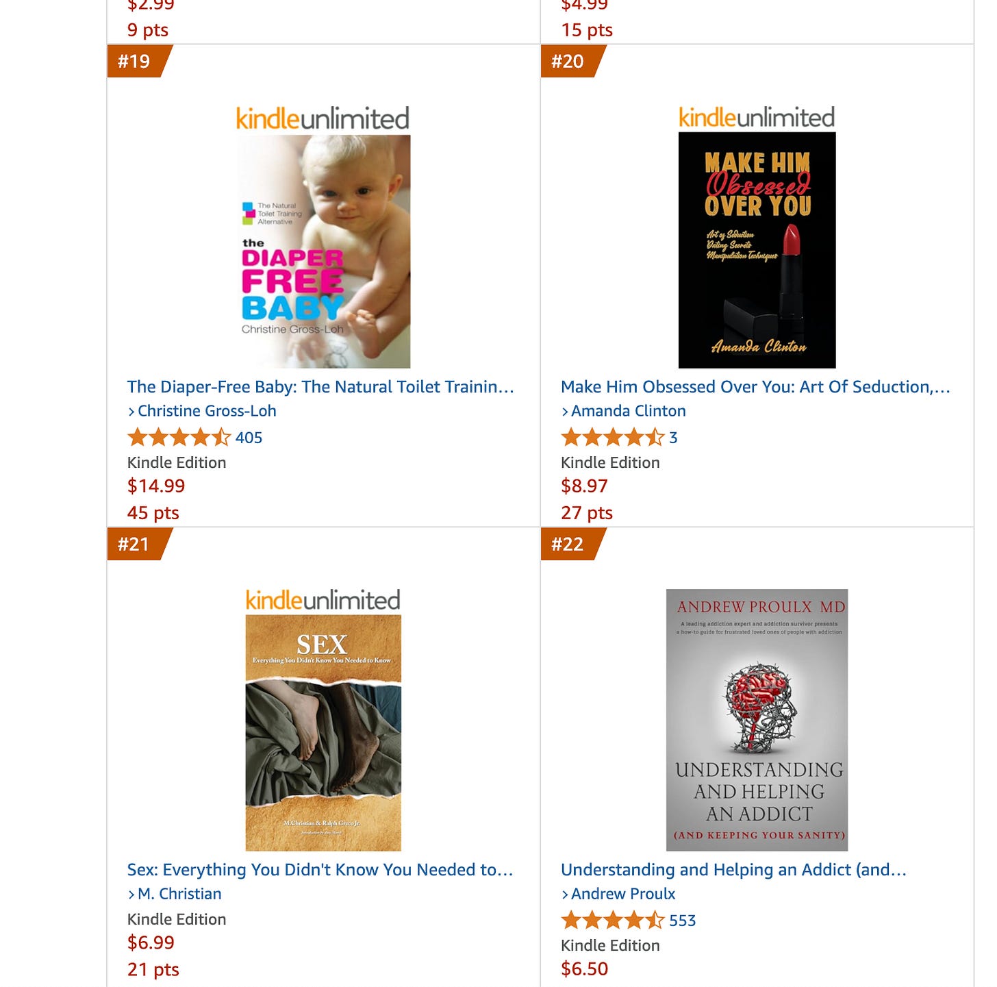 When I entered the metadata for this title, I focused on relationships, dating and intimacy— there is no mention of parenting in this book of sex advice essays. How Amazon made that connection I do not know, but I do know when I checked on the title’s performance it sat beside a book the diaper-free baby, another on the art of seduction, and one on addiction.