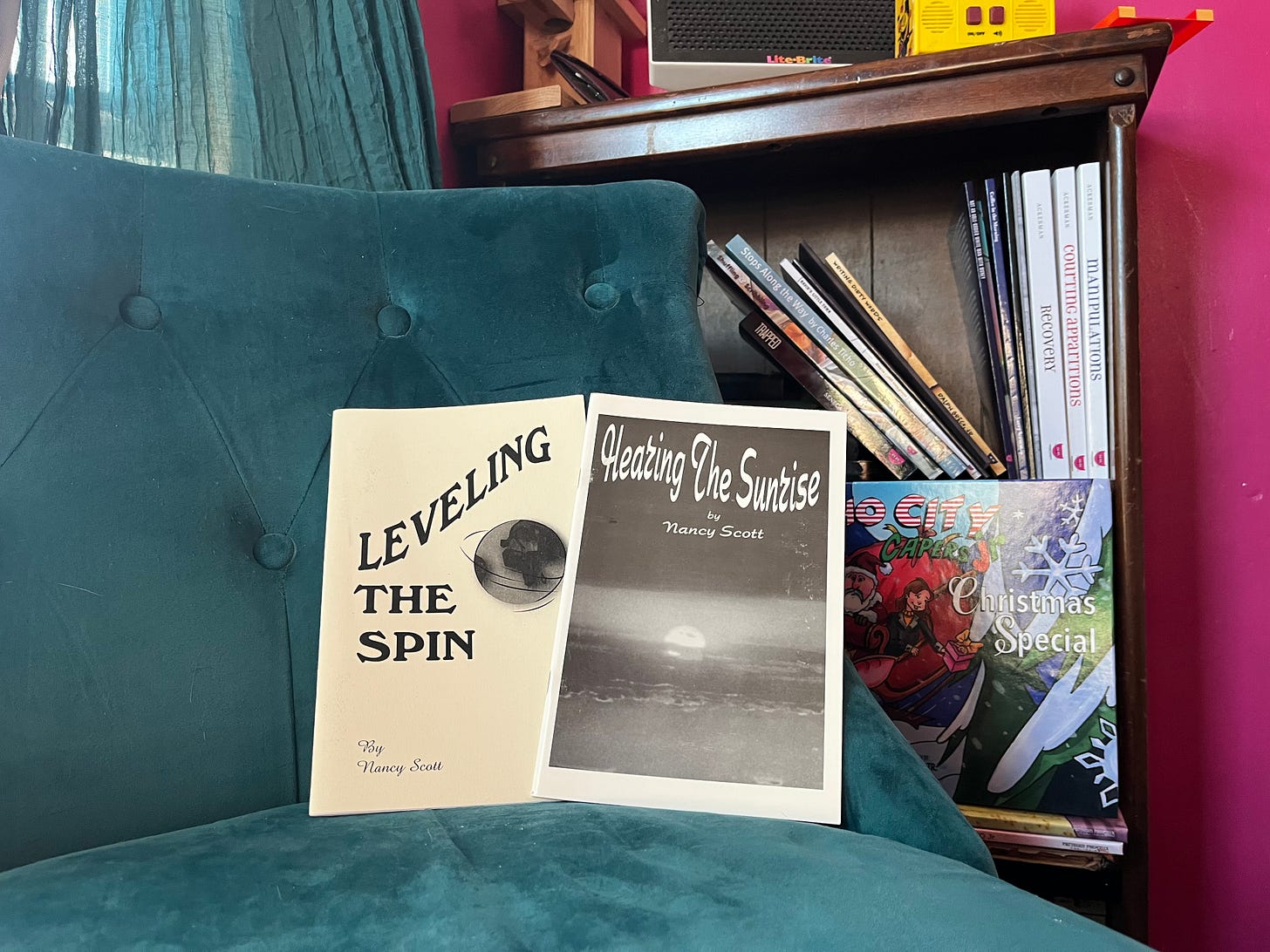 Poet and essayist Nancy Scott will offer a brief reading of some of her work, showing how writing can shift between poetry and prose inspired by the same event. She’ll offer some prompts and some forms hoping to inspire. Her chapbooks Hearing the Sunrise and Leveling the Spin will be available for purchase.