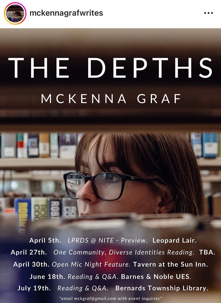 McKenna has also launched her spring book tour. For details, check out her Instagram (@mckennagrafwrites). She will be participating in Lafayette College’s One Community Diverse Identities event on April 27, details yet to be announced. She will feature at Bethlehem’s (Pa.) Tavern at the Sun Inn Open Mic on April 30. The official release party for her new book, The Depths, will be at the Barnes & Noble on the Lower East Side of Manhattan on June 18.