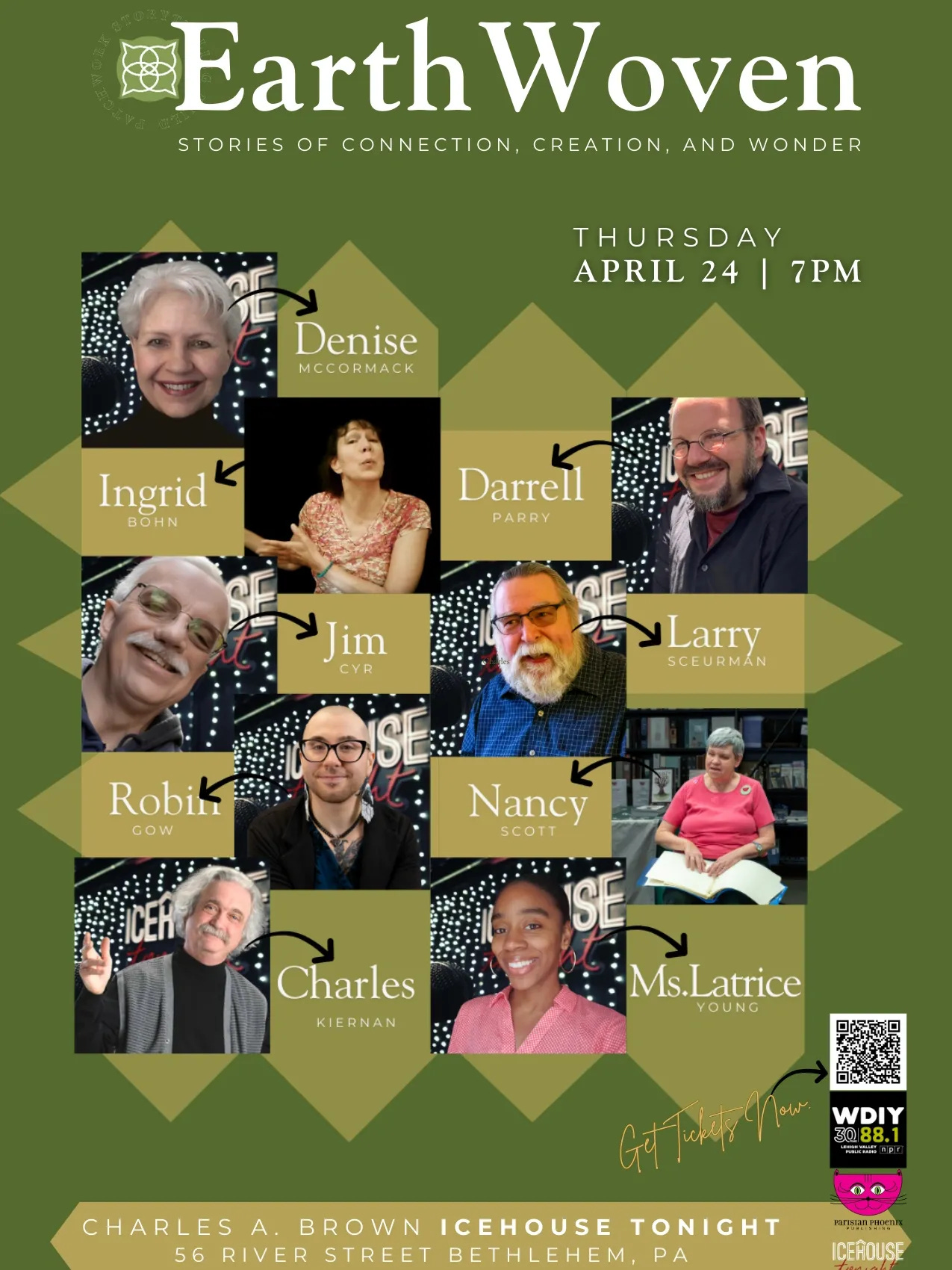 The evening fare features master storytellers Ingrid Bohn, Jim Cyr, Robin Gow, Charles Kiernan, Denise McCormack, and Larry Sceurman, each known for their ability to bring narratives to life with depth and resonance, as well as favorite regional poets Darrell Parry, Nancy Scott, and Latrice Young whose poetry embodies the participatory power of spoken word, each sharing selections of verse inspired by the EarthWoven theme.