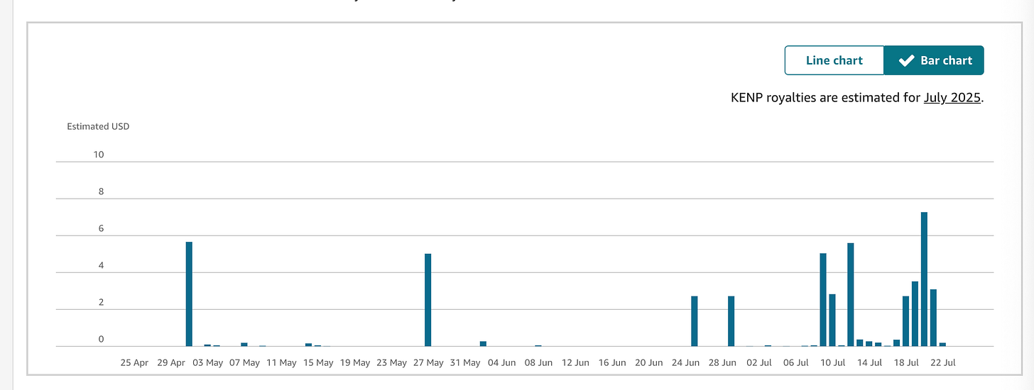 I know some people are curious how Amazon Ads are working for Parisian Phoenix. If you don’t know, we got a grant from the Pennsylvania Creative Entrepreneurship Accelerator Program in May, which paid out in late June, which gave us $1,000 to spend on Amazon Ads. We are $600 in, and we survived an Amazon Prime Week. The chart above shows our estimated royalties from late April to the present. You can see that the advertising has made a difference— but has the gain surpassed the cost?