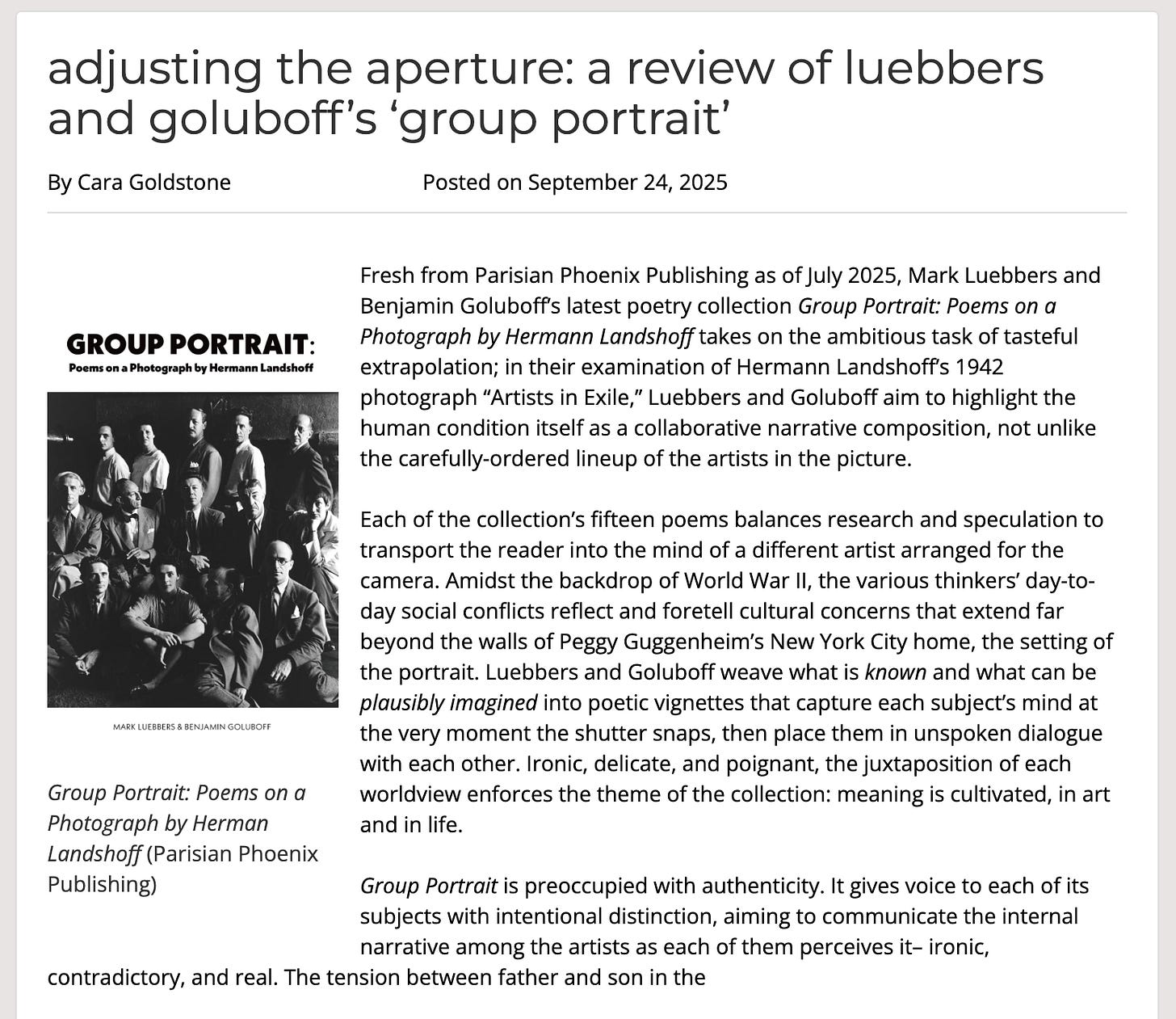 Another book review appeared for Group Portrait, this time by Cara Goldstone in The Bookends Review, read more here.