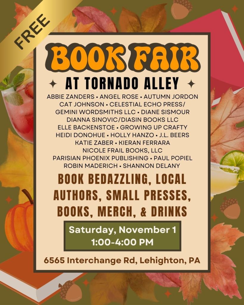 November 1: Angel Ackerman and Dianna Sinovic at Books and Booze at Madness Distillery in Lehighton, Pa. (21 and older only) 1 to 4 p.m.