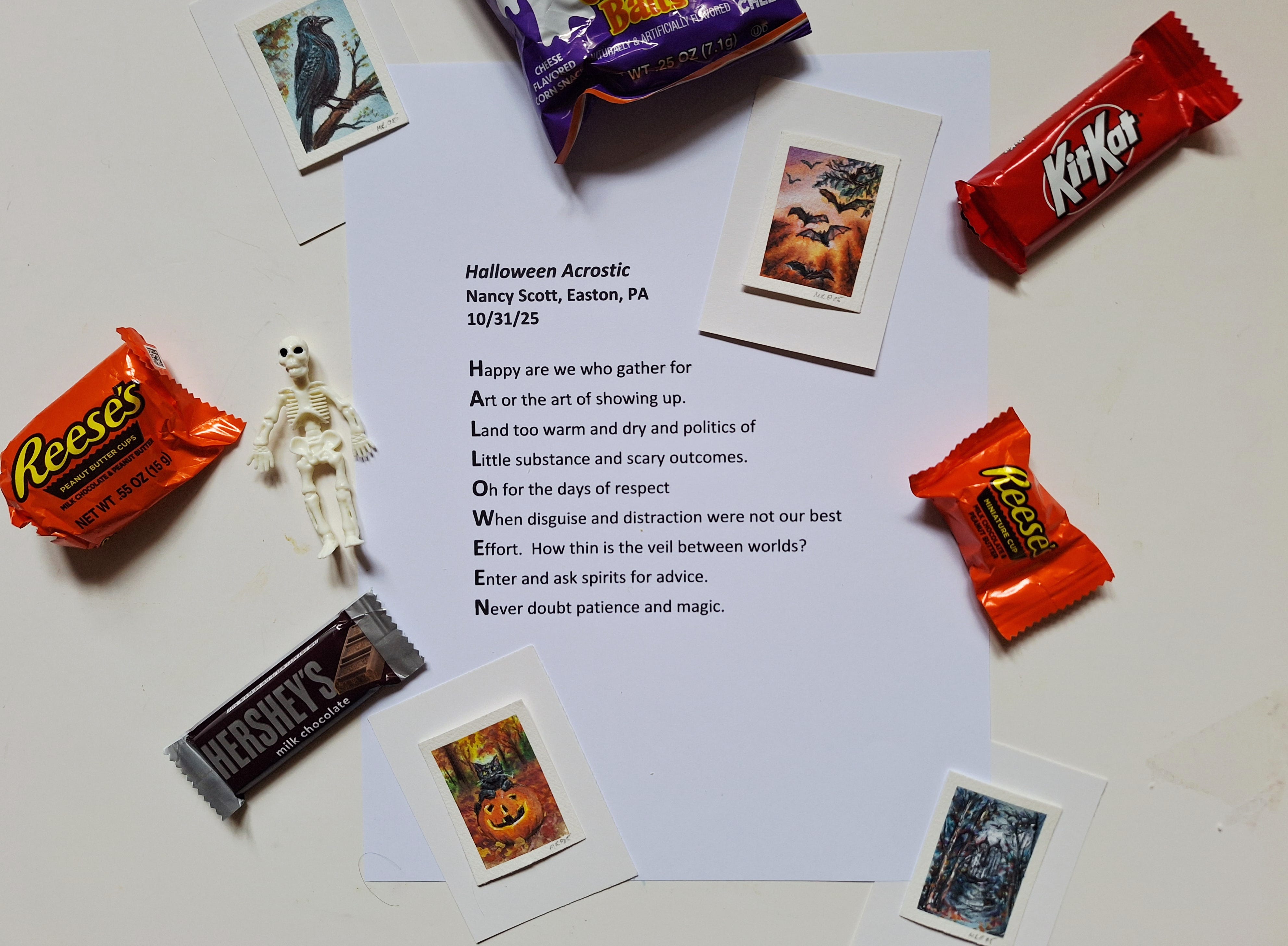 Speaking of Nancy Scott, she and artist Maryann Riker of Justarip Press have a collaborative acrostic poem for Halloween.Halloween Acrostic by Nancy Scott; Art by Maryann Riker