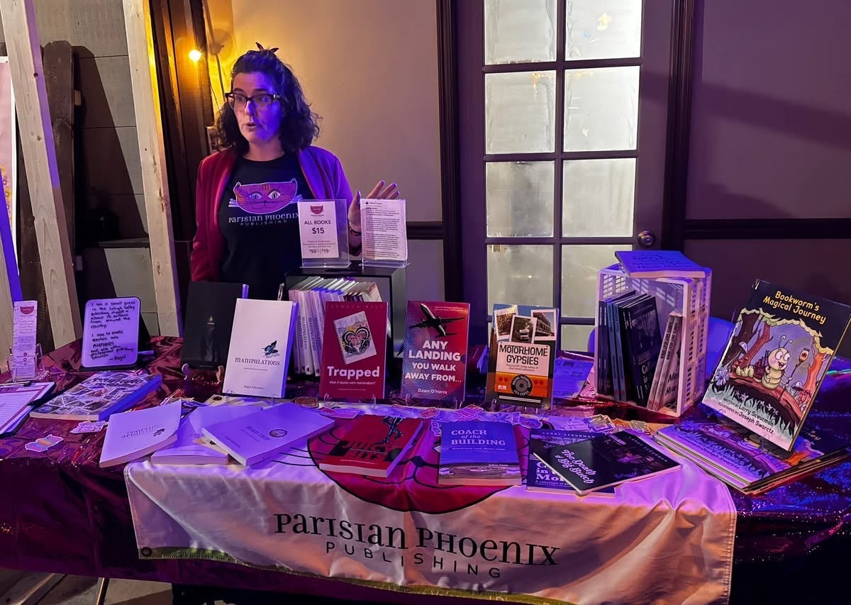 I brought the Fashion and Fiends series because even though it’s horror, it has vibes of paranormal romance, dark fantasy, and women’s fiction. I brought the Juicy Bits anthology because it seemed to suit the Booze and Books 2 theme. And I brought more traditional romances— sweet Any Landing You Walk Away From… and rom-com Trapped: What if Skunks Were Matchmakers?