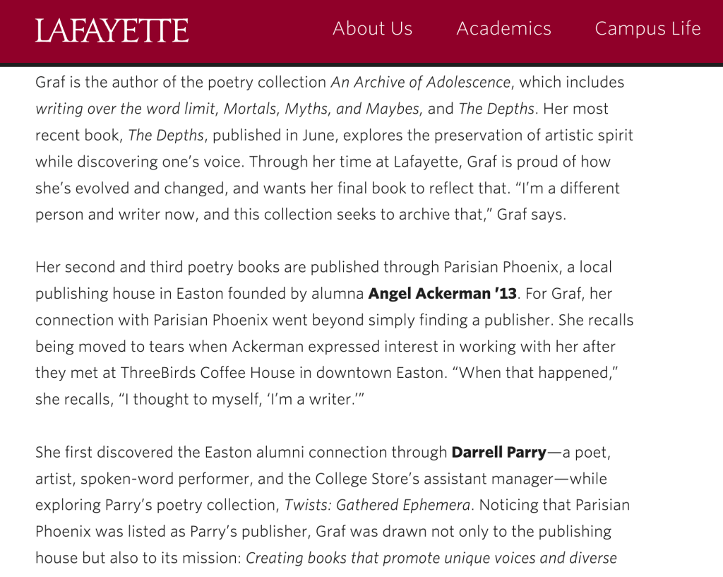 Lafayette College featured McKenna Graf, the poet behind the Archive of Adolescence poetry series, on their web site last week– talking about her experience on campus and as a published poet.