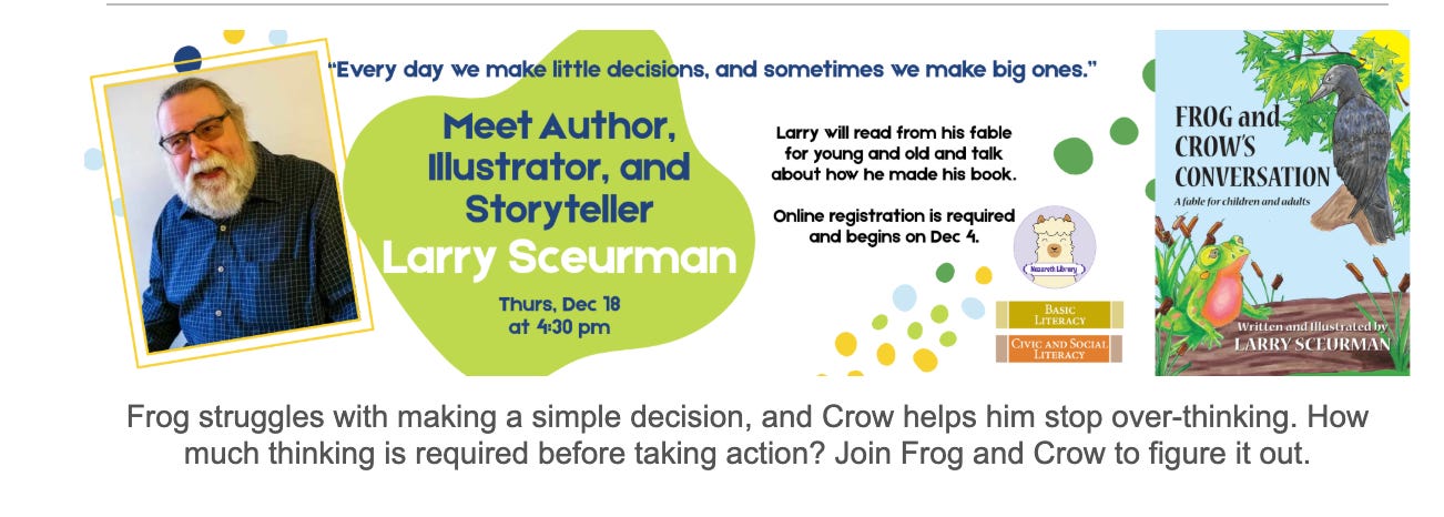 - On December 18, Larry Sceurman will be reading Frog and Crow’s Conversation to children ages five and up, Nazareth Area Memorial Library at 4:30 p.m. For more information (registration is required and opens December 4) click here.