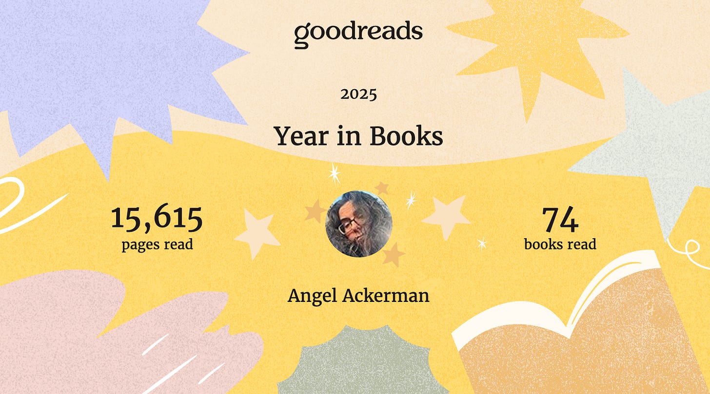 Let’s take a look at what I read in 2025. According to Goodreads, I read more than 15,500 pages in published books. I say published books because I also read unsolicited submissions for Parisian Phoenix and piles of pages for editing and critique.