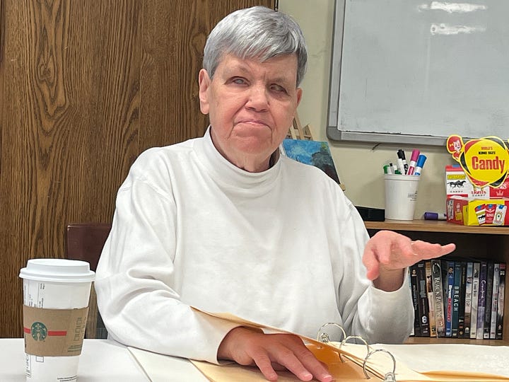 The celebration for Nancy Scott’s 1,000 career bylines included candy cigarettes, espresso, and croissants reminiscent of the beat poets in a long-lost mid-twentieth century Paris cafe. Let me give you this video of Nan reading her poem “The Knife,” which appeared in Disabled Tales, an online journal from the United Kingdom, as byline 999. You can see the original post here.