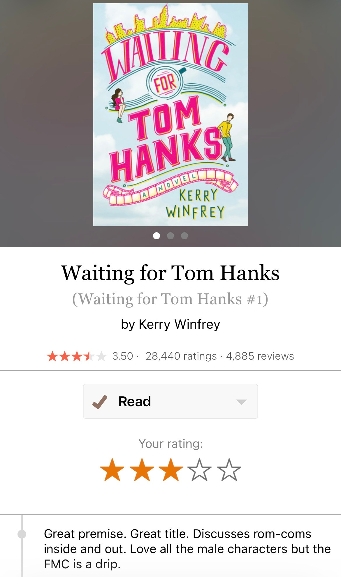 - Waiting for Tom Hanks, Kerry Winfrey. I loved the male characters in this one, but in my Goodreads review I called the female protagonist “a drip.” I still gave the book a three-star rating, so it could be considered a quick and fairly painless read. This book launches the Waiting for Tom Hanks book series. Main character Annie is a screenwriter who lands a job working as the director’s assistant on a movie set. She’s convinced her own rom-com will end with her meeting her own Tom Hanks-style character, but instead she ends up with a cocky movie star.