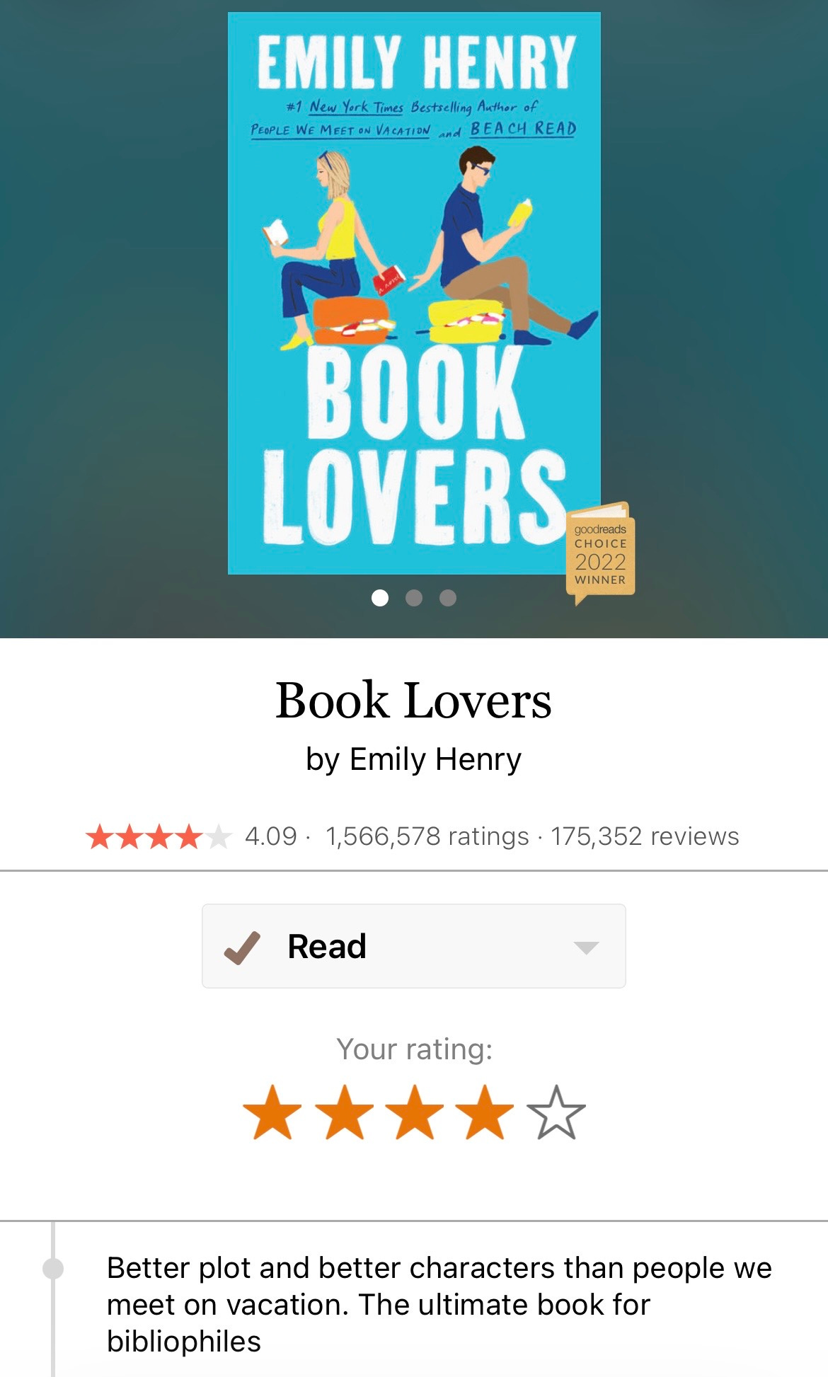 - Book Lovers, Emily Henry. This has been my favorite Emily Henry book that I’ve read, much better than People You Meet on Vacation. The characters are more complex and the plot has more meat than I’ve come to expect from an Emily Henry book. Nora plans a vacation with her sister to visit the small town setting of their favorite book, expecting it to revitalize their lives, only to discover the town’s a dud. Fiction is, after all, fiction. While in town, Nora, a successful literary agent, keeps running into Charlie, a moody book editor also from the New York Publishing scene.