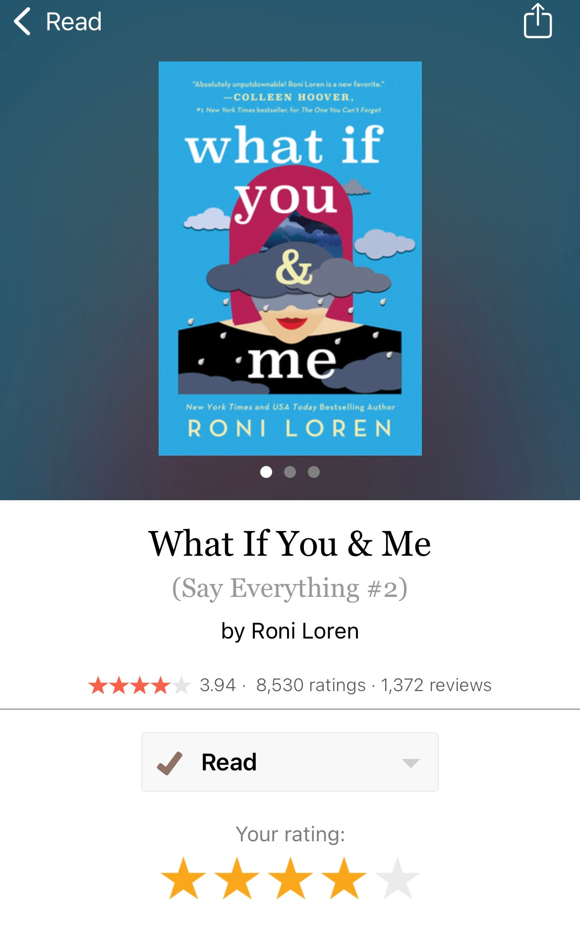 - What if You & Me, Roni Lauren. The main female character is a horror author and the main male character is an amputee. The book was a decently written, mindless read. Lots of sex, as one would expect in a humorous contemporary romance. Both main characters have these moments where I hated them. And at some points, I felt the premise of the novel went too far. I think the depiction of the writer’s mind is fantastic, but the idea that a woman in her early 20s could be a successful mid-list author who doesn’t need to have a job on the side is pure fantasy. But what gets me— she hardly ever writes in the story.